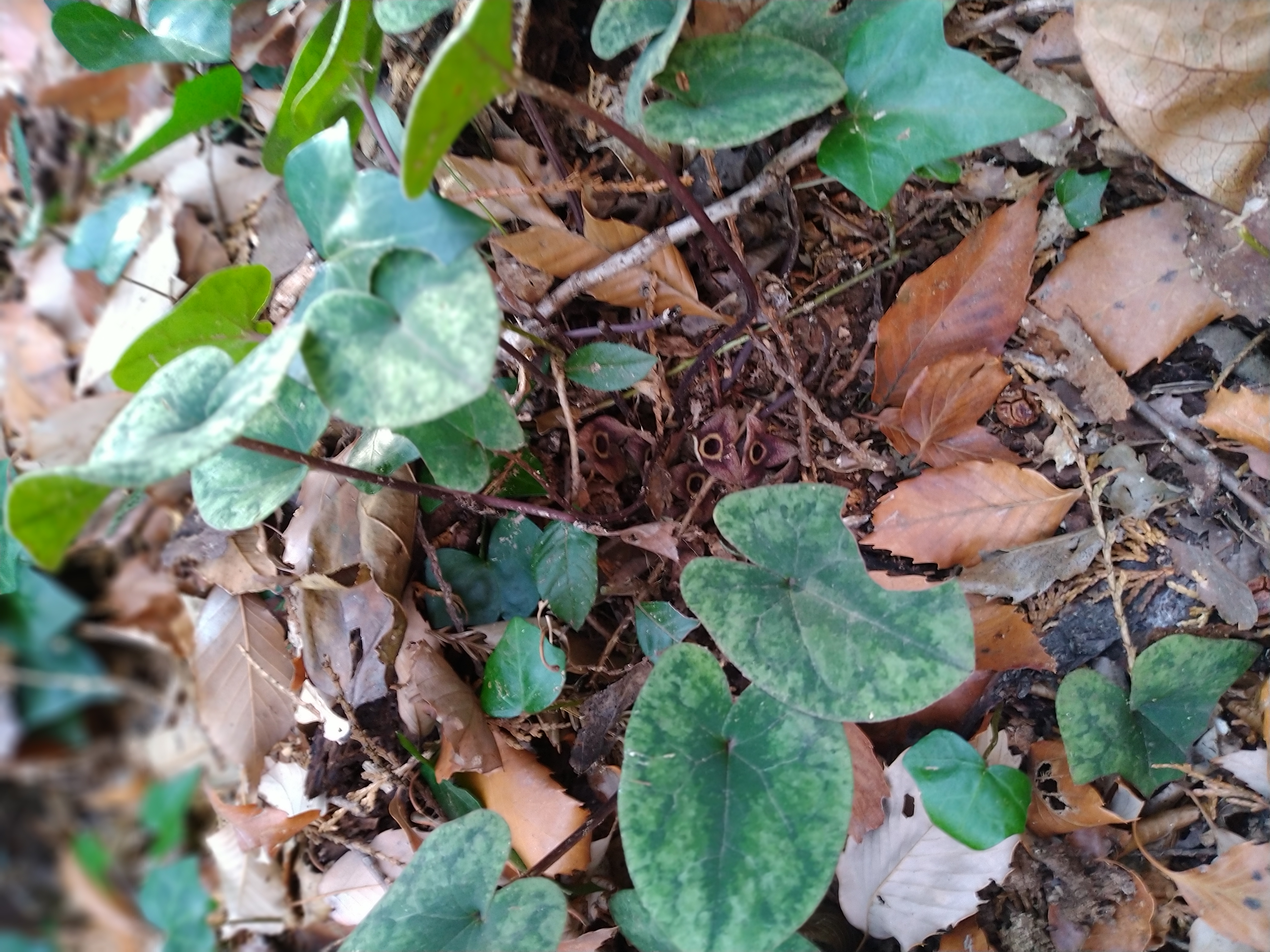 カンアオイ ツイート 2月初旬、寒さが厳しい一日だった。活動は北コースに沿った斜面の下草刈り。冬枯れの山での彩は笹、アオキ、サカキ、シラカシなど数少ない。そんな中、桜の古木に寄り添うようにシクラメンの葉に似たハート形の濃いグリーンのカンアオイを数株見つけた。 カンアオイは埼玉県の準絶滅危惧種にも分類されている貴重な植物だ。 葉をそっと寄せてみると三角形の花弁が三つあった。こんな出会いも冬の活動の楽しみの一つだ。 カンアオイ